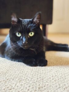 black cat relaxing on a beige carpet