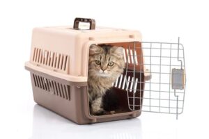 cat looking out from open cat carrier