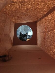 black cat looking into a paper bag tunnel