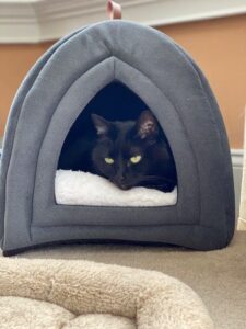 black cat in a covered bed