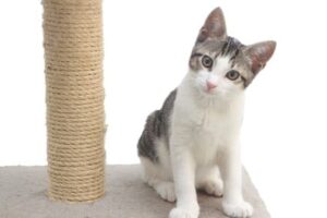 gray and white kitten sitting near scratching post